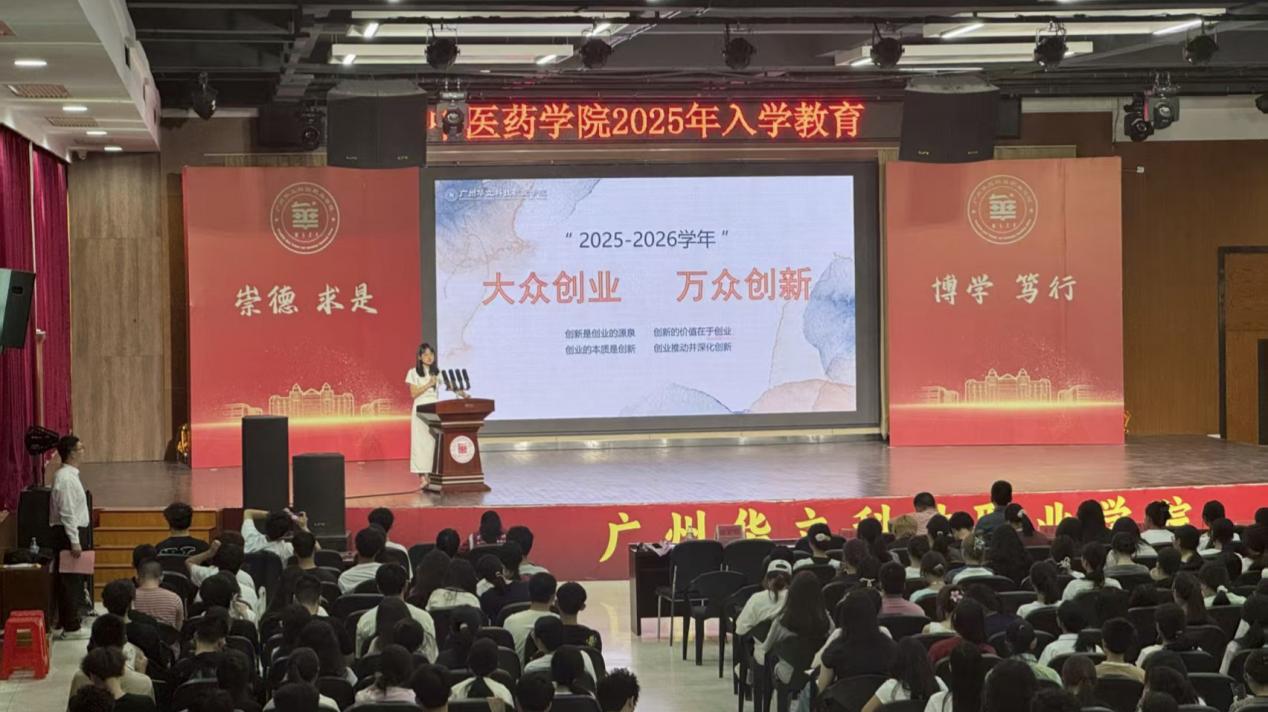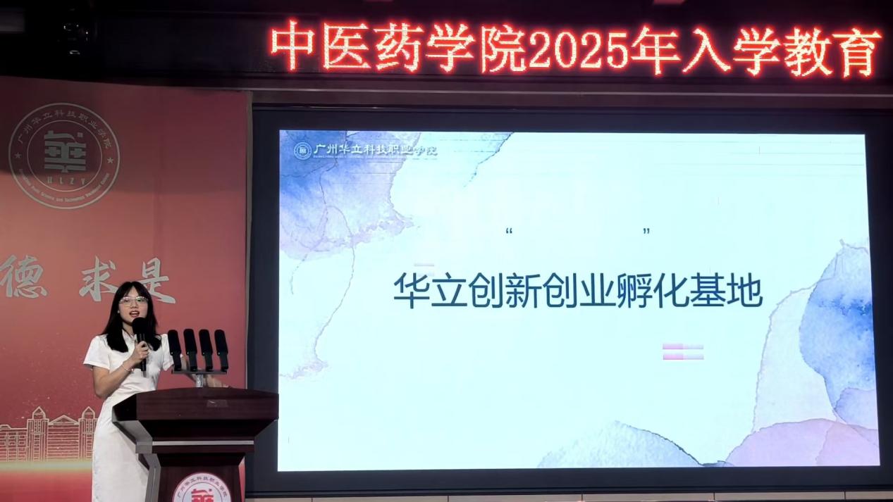 2025年9月5日,广州华立科技职业学院中医药学院2025级新生入学教育之“创新创业第一课”在图书馆八楼学术报告厅成功举行。主讲人为中医药学院创新创业指导老师刘嘉楣,参与本次活动的人员有中医药学院副院长、直属党支部书记曾祥彪和中医药学院直属党支部专职副书记、学生管理办公室副主任陈辉,以及中医药学院全体新生。