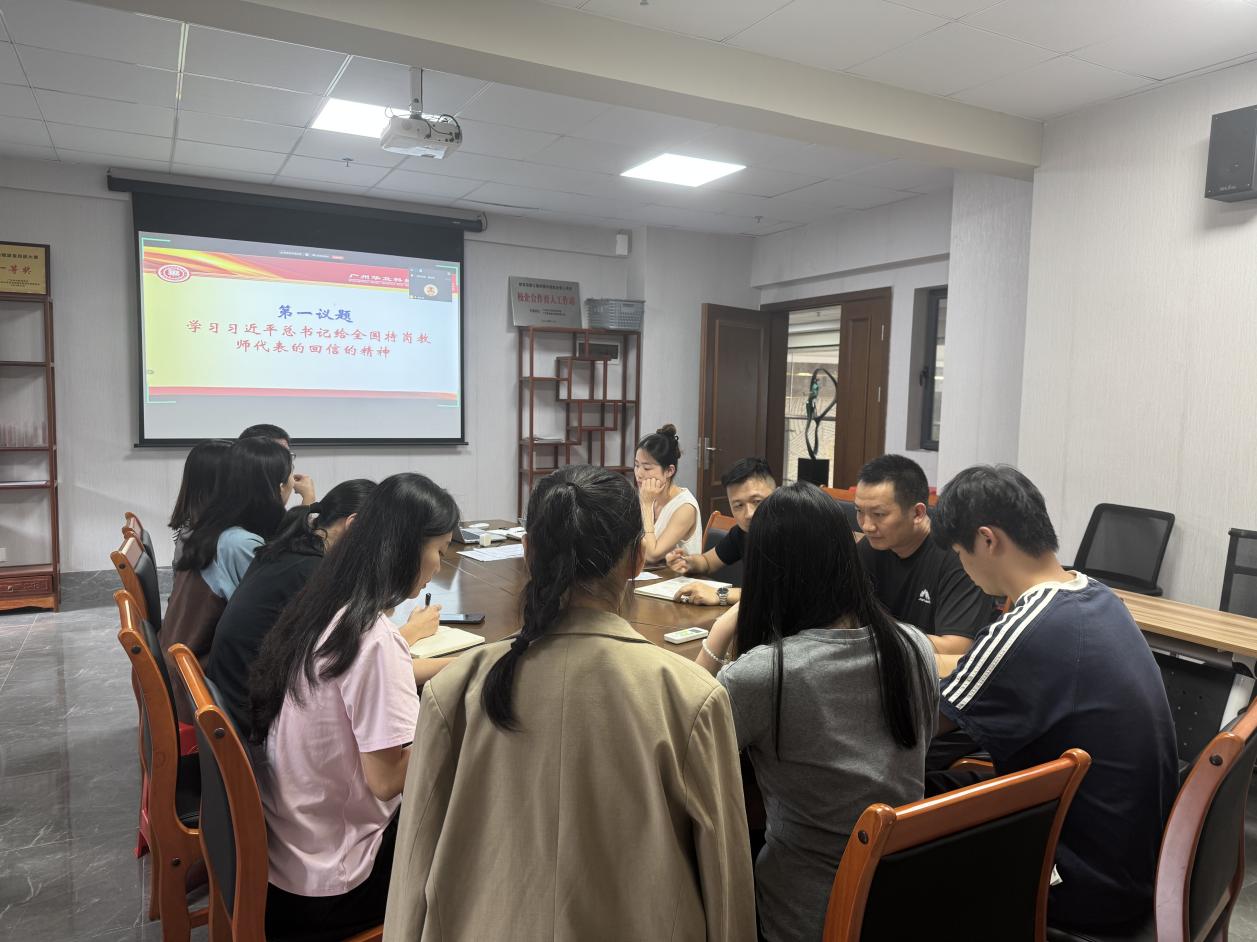 会议伊始,曾祥彪书记带领党员进行第一议题学习,共同学习《习近平总书记给全国特岗教师代表的回信精神》。曾书记强调,党员教师要牢记党的教育大业,充分利用现有教育条件,切实发挥好教师的育人角色,为培养德智体美劳全面发展的社会主义建设者和接班人贡献力量。