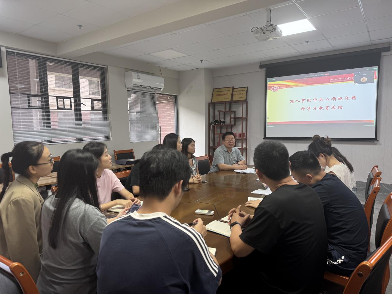 随后,曾祥彪书记传达了广东省开展深入贯彻中央八项规定精神学习教育工作简报,并对深入贯彻中央八项规定精神学习教育情况进行了全面总结。他从主要做法、取得成效、存在问题等方面展开,指出支部严格按照学校党委要求,成立了学习领导小组,精心制定学习方案,并扎实开展了各项学习活动,取得了实质性的成效。通过一系列的学习教育活动,支部党员的纪律意识和规矩意识得到了进一步增强。