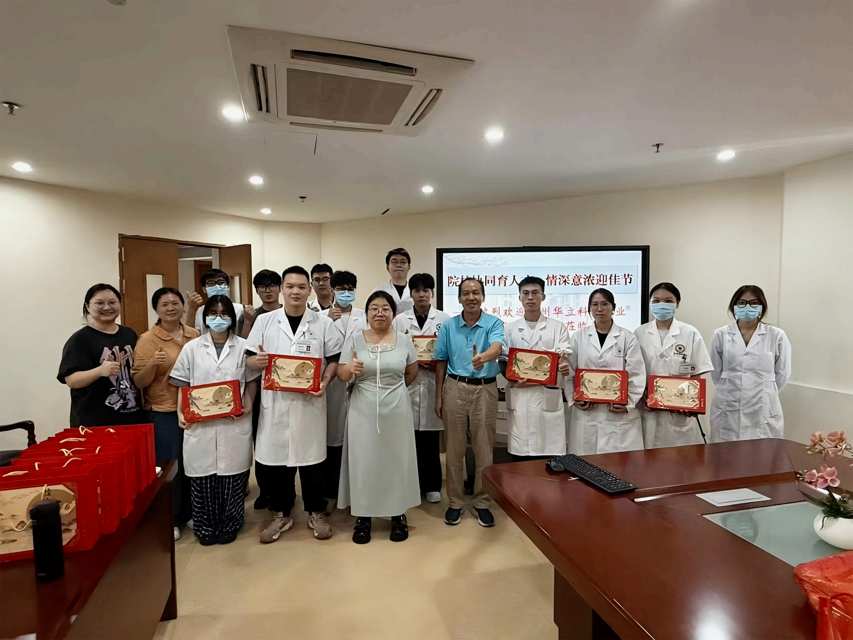 座谈会在温馨的节日祝福中结束。会后,学院领导亲自将象征着团圆与美满的中秋月饼和水果礼盒送到每一位学子手中。紧接着,全体人员合影,记录下这充满关怀与期望的时刻。此次慰问,不仅驱散了学子们的思乡之情,更坚定了他们的从医信念,也为院校合作的深化写下了浓墨重彩的一笔。