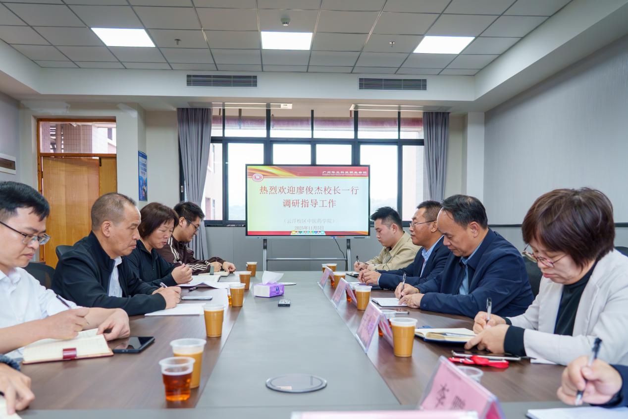 为全面了解中医药学院云浮校区工作开展情况,精准破解学院发展难题,推动中医学专业高质量发展,2025年11月5日下午,校长廖俊杰率队到我院云浮校区调研指导工作,副校长高尧来、副校长王洪艳、校长助理李鹏、人事处副处长邱志宏以及教务处副处长李涛陪同参加调研。
