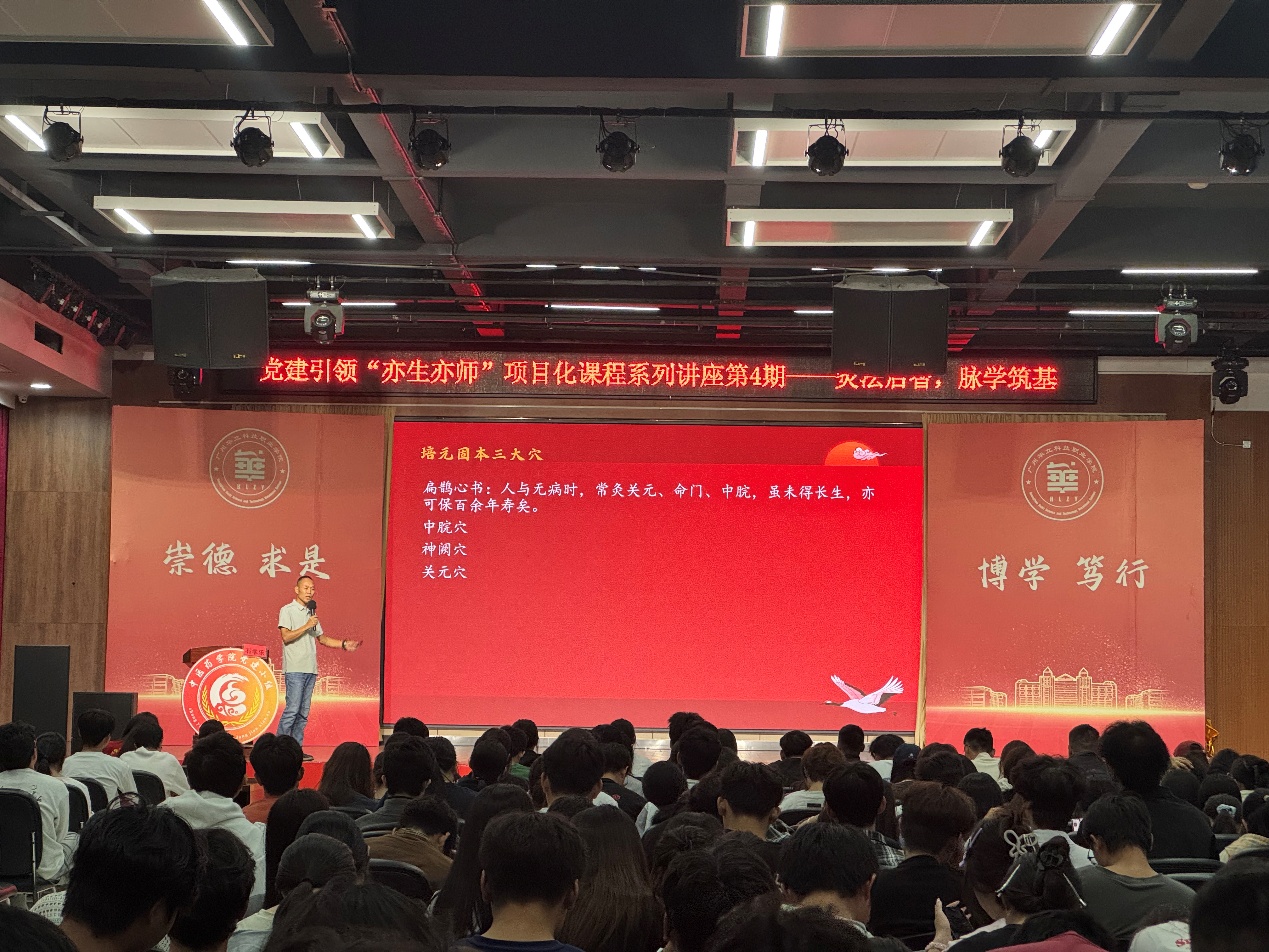 2025年11月6日,图书馆八楼暖意融融、座无虚席,中医药学院党建小组联合中医药应用研究所精心打造的党建引领“亦生亦师”项目化课程系列讲座在此顺利启幕。作为中华优秀传统文化的璀璨瑰宝,中医药文化承载着千年先民的健康智慧,而艾灸与脉诊更是其中历经岁月沉淀的核心技艺。本次讲座以党建为引领,搭建起“师生共建、教学相长”的交流平台,旨在让青年学子近距离感受中医药的独特魅力,传承经典、启迪新知,为中医药文化的当代传播注入青春活力。