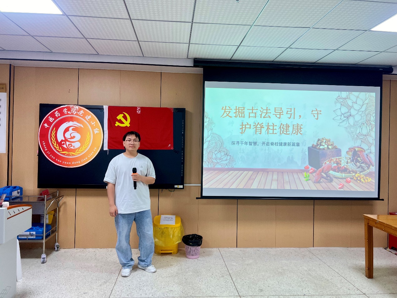 2025年11月26日晚,由中医药学院直属党支部主办,中医药学院党建小组与中医药应用研究所协办的党建引领“亦生亦师”项目化课程系列讲座第六期——“发掘古法导引,守护脊柱健康”在西二104针灸推拿实训室成功举行。本次活动吸引了中医药学院50名学生积极参与,旨在传承中医养生智慧,提升学生脊柱健康意识与自我保健能力。
