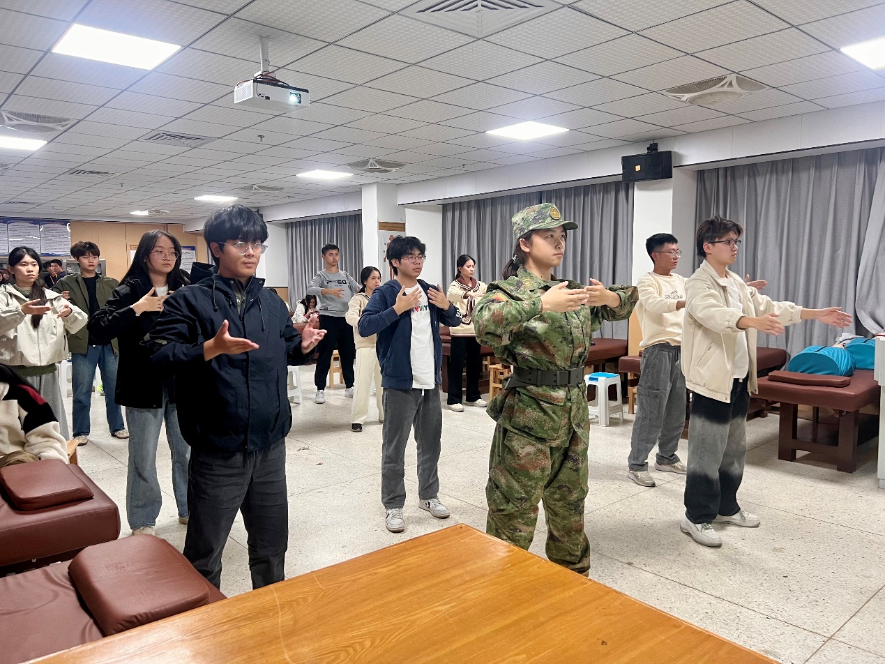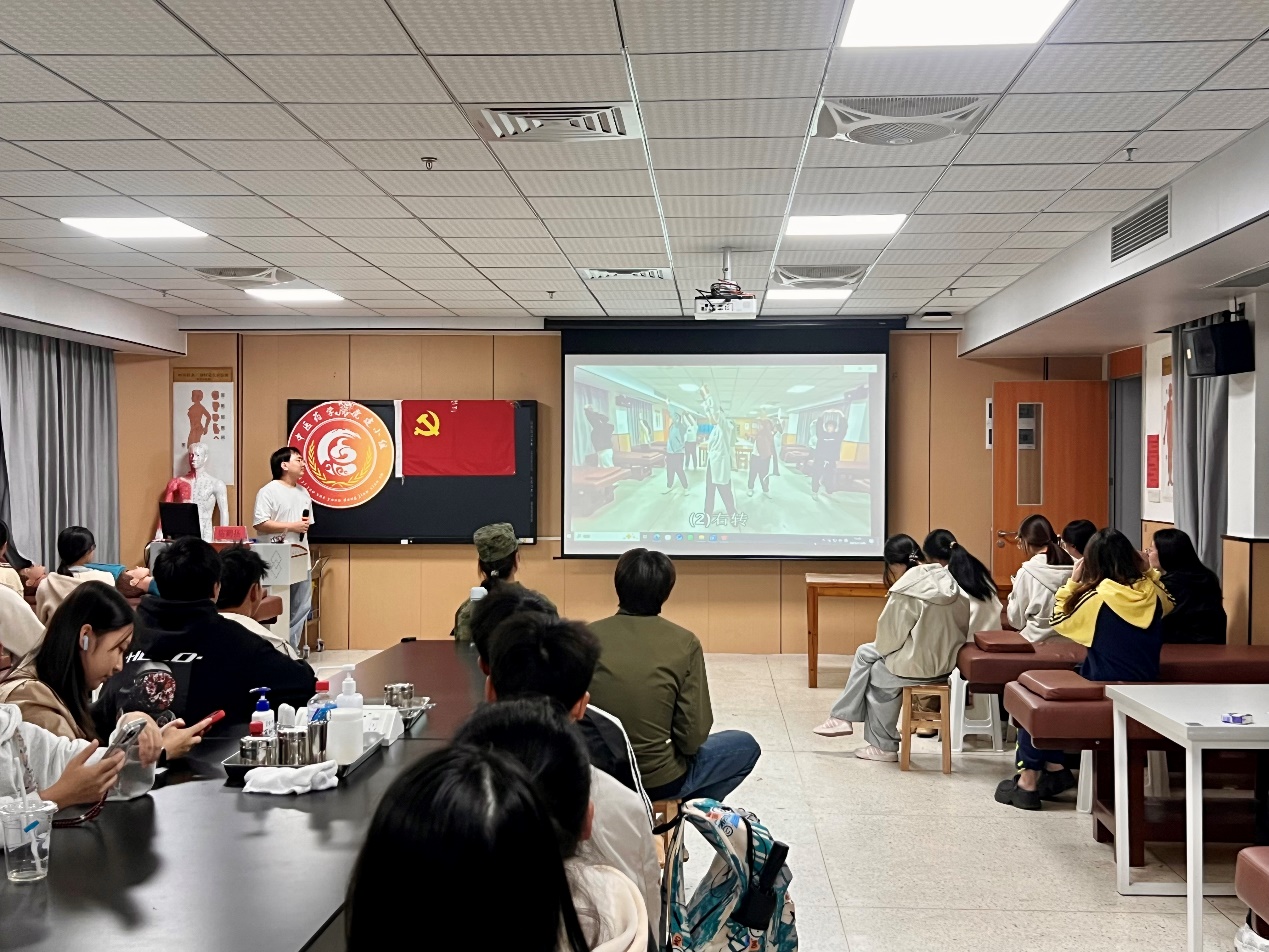 随后,现场播放了由中医药应用研究所讲师团精心录制的导引动作教学视频,系统展示了多个针对颈、胸、腰椎的经典导引姿势,包括八段锦中关于脊柱保健的精华招式,视频详细的要领讲解,确保每个动作细节都能清晰呈现。在观看过程中,同学们全神贯注,这段教学视频不仅再现了标准动作,将古老的导引术以现代化方式呈现,为接下来的实操环节提供了直观的参考依据,让学生们能够更快地掌握动作要领。在讲师和党建小组工作人员的引导下,学生们分为若干小组,开展现场实操训练,大家互相纠正动作、讲师团成员巡回指导,确保动作规范,不少同学表示“做完一套动作,肩颈轻松了许多”。