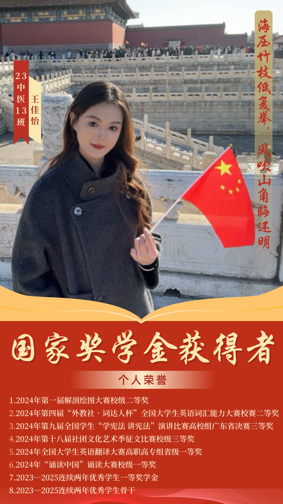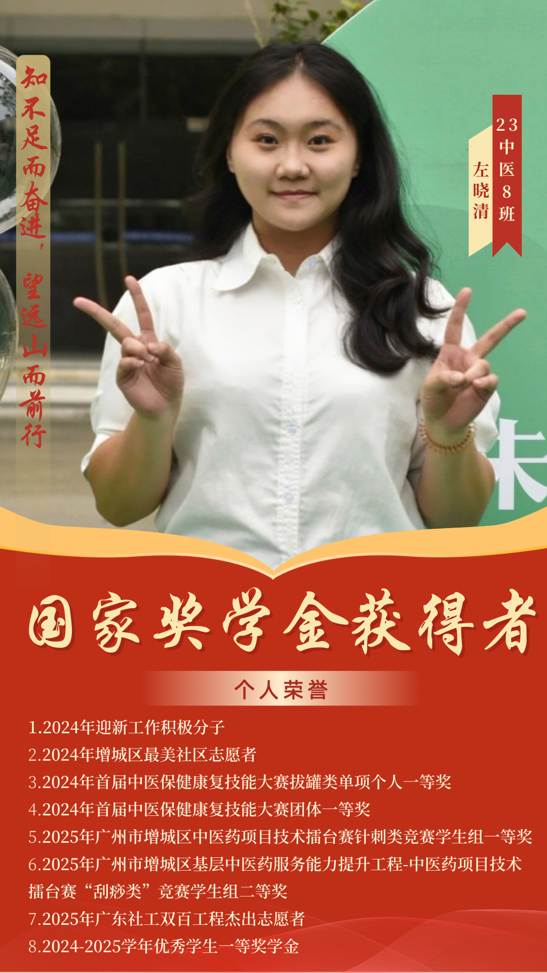 在学业之路上,她勤学善思、笃学不倦,深耕中医药专业知识,潜心钻研专业本领,以综测成绩专业第一、绩点4.23的优异成绩,夯实专业学识根基,用扎实的成绩彰显中医药学子的勤学本色。她深知,中医药的传承与发展,贵在知行合一、技精于勤。在专业技能的赛场之上,她厚积薄发、屡创佳绩:斩获首届中医保健康复技能大赛拔罐类单项个人一等奖、团体一等奖;拿下2025年广州市增城区中医药项目技术擂台赛针刺类竞赛学生组一等奖、刮痧类竞赛学生组二等奖。每一份荣誉的背后,都是她深耕岐黄、苦练技能的坚守,更是她扎根专业、精益求精的初心,尽显中医药学子扎实的专业功底与过硬的实操本领。