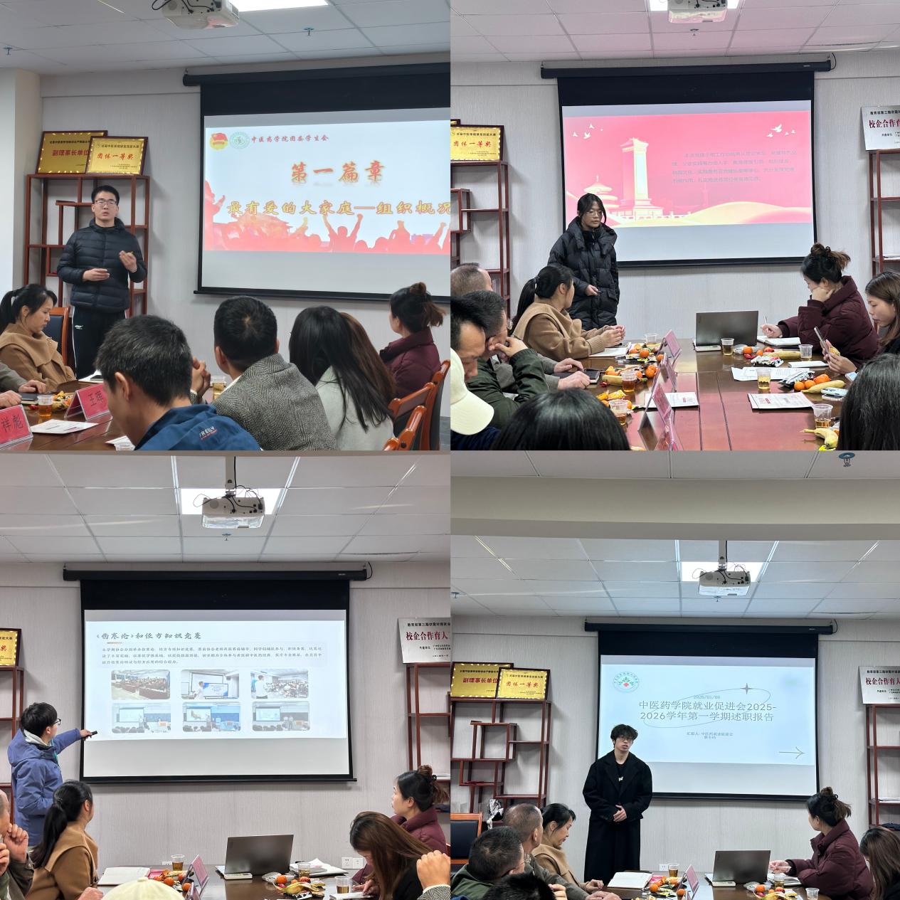 为全面总结本学期学生组织工作成果,明晰未来发展方向,进一步提升学生组织的凝聚力与战斗力,1月6日下午,学院在G1-212会议室隆重举办2025-2026学年第一学期学生组织述职报告大会。本次大会以“杏林述职展硕果,岐黄砺新绘蓝图”为主题,学院院领导、三线主任、各学生组织指导老师出席会议,学生会、党建小组、中医药协会、就业促进会的学生骨干代表共同参与。会议由曾玉梅老师主持。