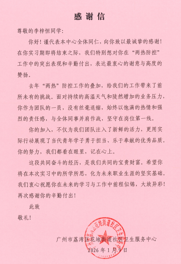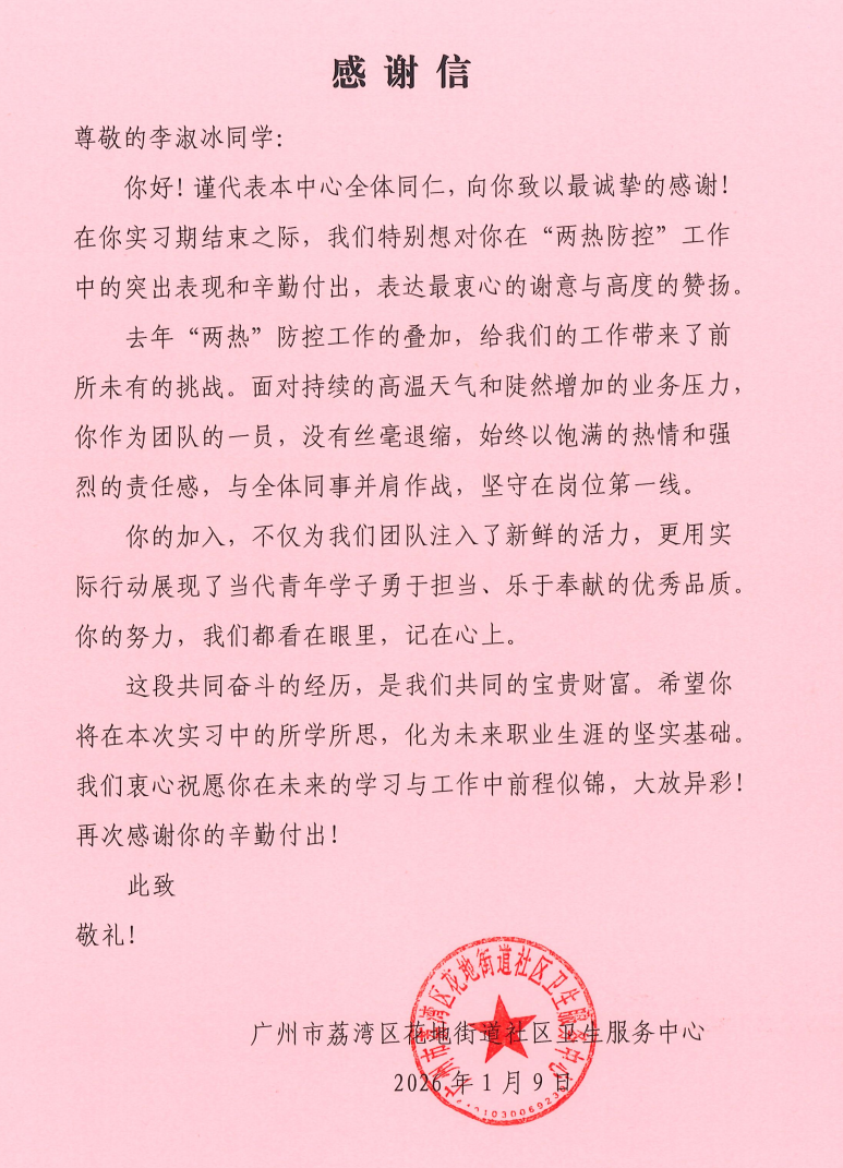 近日,广州市荔湾区花地街道社区卫生服务中心正式向我院发来三封感谢信,对 2023 级实习生李淑冰(23 中医 17 班)、凌桂华(23 中医 17 班)、李梓恒(23 药学 6 班)在基层实习期间的优异表现给予高度评价与特别表扬,充分肯定了三位学子的职业素养与实践能力。