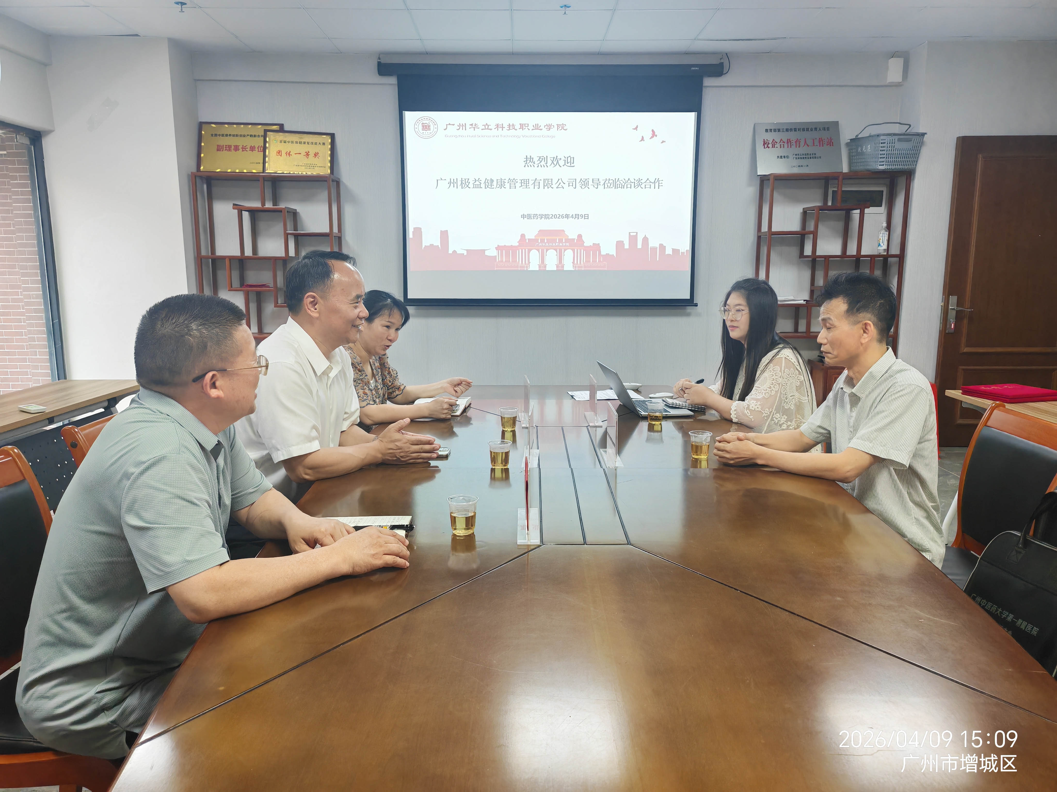 4月9日,广州极益健康管理有限公司负责人到访我校中医药学院,洽谈产教融合、人才培养及中医技艺传承合作事宜。学校校长廖俊杰、中医药学院副院长曾祥彪、王泽秀出席座谈,双方深入交流后正式签订校企合作协议。